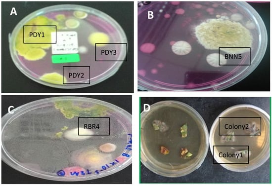 The seven total colonies, coded PDY1, PDY2, PDY3, RBR4, and BNN5 from soil (