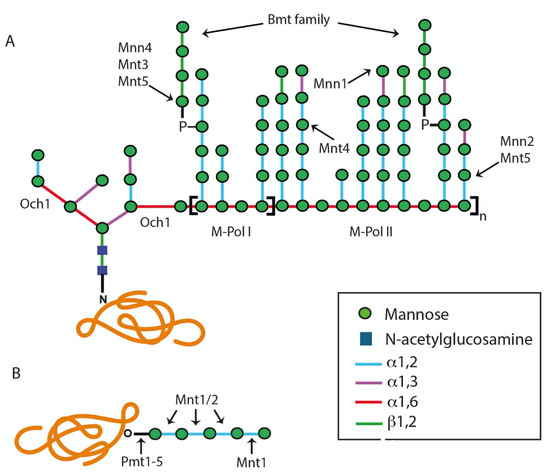 Following the glycosylation steps in the ER, N-linked glycans are elongated by Golgi mannosyltransferases, which require GDP-Man as a sugar donor, and the transport of this compound into the lumen of the Golgi apparatus is mediated by a specific nucleotide sugar transporter encoded by VRG4 [27]. The α-1,6-mannosyltransferase Och1 starts the addition of an α-1,6-mannose unit to the backbone of the N-linked glycan outer chain (Figure 1) [28]. Subsequently, the α1,6-mannose backbone is extended by the sequential action of the mannan polymerase I (Mnn9 and Van1) and mannan polymerase II (Mnn9, Anp1, Mnn10, Mnn11, and Hoc1) enzyme complexes [13,24,28]. This α-1,6-mannose backbone is branched with α-1,2-oligomannans by the action of mannosyltransferases Mnt3, Mnt4, Mnt5, Mnn2, and Mnn5, and this may be capped with terminal α-1,3-mannoses by the action of the mannosyltransferase Mnn1 (Figure 1) [13]. In C. albicans, it is frequently found that the α-1,2-mannose branches are further β-mannosylated, a mechanism that is carried out by the BMT gene family [29]. Additionally, in this organism, the N-linked glycans can be modified by mannosyl-phosphate moieties, named phosphomannans, which can work as molecular scaffolds to synthesize α-1,2-mannoligosaccharides [24], in a process that involves the MNN4-like gene family and the mannosyltransferases Mnt3 and Mnt5 [30,31].