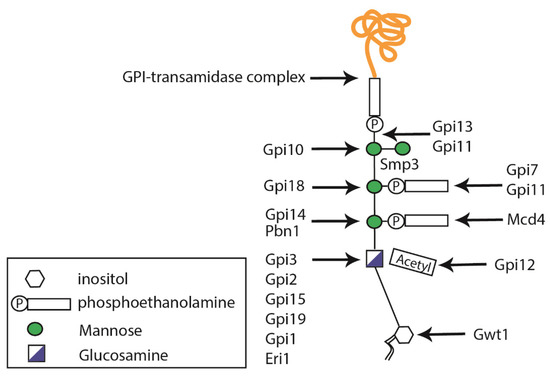 GPI anchors are structurally complex glycophospholipids that are post-translationally attached to the C-terminal end of proteins containing the appropriate GPI signal sequence [35]. The first step in GPI biosynthesis takes place in the ER, where a phosphatidylinositol receives GlcNAc from UDP–GlcNAc, in a reaction catalyzed by a multi-subunit GPI-N-acetylglucosaminyltransferase (GPI-GnT) complex [6], whose catalytic subunit is encoded by GPI19 (Figure 2) [13,36]. Then, the inositol-acyl group is removed during GPI maturation, triple mannosylated, and decorated with two–three phosphoethanolamine groups at the different mannoses (Figure 2) [6]. In fungi, the addition of a fourth mannose residue is required and catalyzed by the mannosyltransferase Smp3 [37,38]. The complete GPI-anchored protein is formed once the anchor is attached to a new translocated protein in the ER lumen, via the GPI transamidase complex composed of Gaa1, Gpi8, and Gpi16 [39], and is then transported via the secretory pathway to the cell wall or plasma membrane.