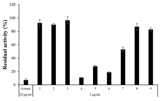 Residual activity of the ELF29 extract and nine fractions collected from the C18 column chromatography. Residual activities of the extract and the fractions were measured at 20 and 2 µg/mL, respectively.