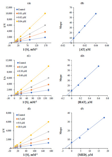 Lineweaver–Burk plots (A,C,E) for hMAO-A inhibition by AT, HAT, and MED, and their secondary plots (B,D,F) using their slopes following inhibitor concentrations. Five different substrate concentrations (0.006, 0.012, 0.03, 0.06, and 0.12 µM) were used, and inhibitors were added to make three concentrations, i.e., ~1/2 × IC50, ~IC50, and ~2 × IC50. Triplicate experiments determined error bars.