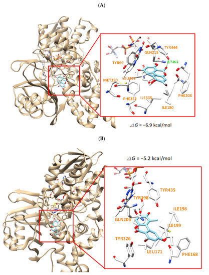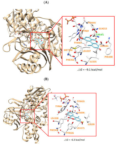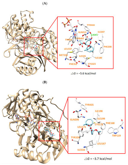 The docking simulation of AT with hMAO-A (2Z5X) (A) and hMAO-B (3PO7) (B) as determined by the UCSF Chimera. AT interacts through a hydrogen bond with Tyr444 residue of hMAO-A at a distance of 2.814 Å.