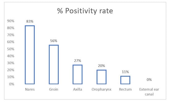 Positivity rate (%) of various samples for screening of Candida auris colonization in patients.
