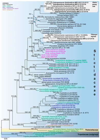 In the phylogenetic tree (Figure 2), Cryptodiscus, Cyanodermella, Fitzroyomyces, Ostropomyces and Sphaeropezia are monophyletic, while Schizoxylon and Stictis are polyphyletic. Fitzroyomyces, Eriospora, Neofitzroyomyces and Phacidiella form a clade with high statistical support (100% MLBS/1.00 PP). The asexual morphs of these genera commonly occur on plant leaves, whereas the sexual morph of Fitzroyomyces has been found on dead woody stems [23,24,49,50]. The lichenized genera Geisleria and Absconditella formed sister clades with high support (92% MLBS/0.99 PP). Xyloschistes platytropa, a saprobe [30], is sister to Ingvariella bispora, a lichen [46], with maximum support (100% MLBS/1.00 PP). Our strain MFLUCC 21-0111 together with F. cyperacearum and F. pandanicola formed a monophyletic clade with maximum support (100% MLBS/1.00 PP). The new strains MFLUCC 21-0112 (from mycelia) and MFLU 21-0115 (from fruiting bodies) clustered with Ostropomyces pruinosellus with maximum statistical support values (100% MLBS/1.00 PP). The strains MFLUCC 21-0113 (from mycelia) and MFLU 21-0116 (from fruiting bodies) grouped with O. thailandicus also possessed maximum support (100% MLBS/1.00 PP).