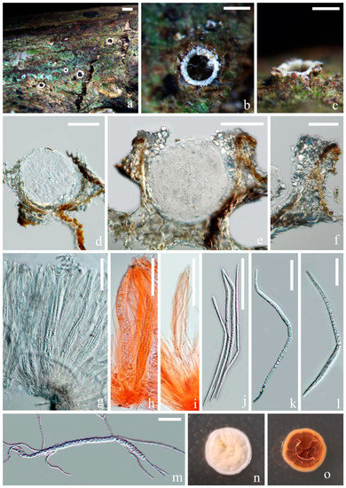 - Yang, C.L.; Baral, H.-O.; Xu, X.; Liu, Y. Parakarstenia phyllostachydis, a new genus and species of non-lichenized Odontotremataceae (Ostropales, Ascomycota). Mycol. Prog. 2019, 18, 833–845. [Google Scholar] [CrossRef]