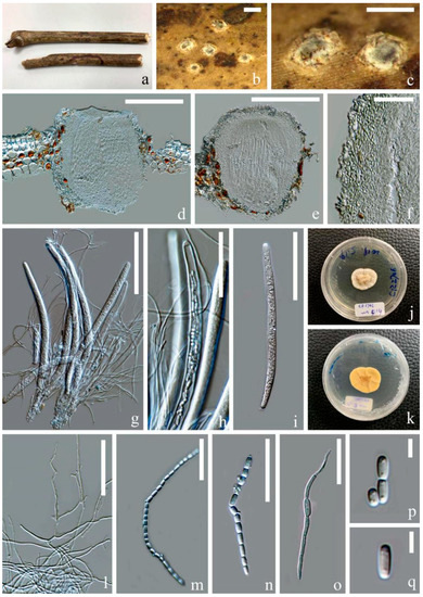 Ostropomyces pruinosellus (MFLU 21-0115). (a) Substrate; (b,c) ascomata on host; (d,e) vertical sections through ascomata; (f) excipulum; (g–i) Asci; (j,k) upper and lower view of culture on PDA media after incubation for two months; (l) paraphyses; (m,n) catenulate ascospores; (o) germinating ascospore; (p,q) part-spores. Scale bars: (b,c) = 500 μm; (d,e) = 200 μm; (g,i) = 100 μm; (h,l) = 50 μm; (f,m–o) = 30 μm; (p,q) = 5 μm.