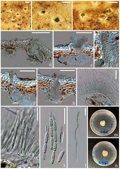 - Crous, P.W.; Wingfield, M.J.; Schumacher, R.K.; Summerell, B.A.; Giraldo, A.; Gené, J.; Guarro, J.; Wanasinghe, D.N.; Hyde, K.D.; Camporesi, E.; et al. Fungal Planet description sheets: 281–319. Persoonia 2014, 33, 212–289. [Google Scholar] [CrossRef]