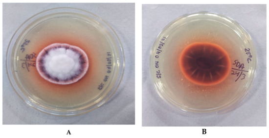 Macroscopic appearance of Fusarium lichenicola at 25 °C after 4 days of incubation. (A) Obverse showing white, short aerial hyphae with a pinkish-red rim; (B) reverse brown with a diffusible chestnut brown-red pigment.
