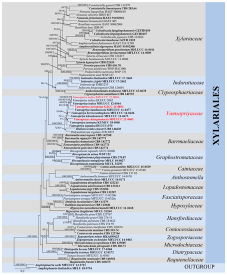 Vamsapriya was introduced by Gawas and Bhat [26] based on abundant asexual morphs of the genus, which is characterized by erect, cylindrical, dark brown, synnematous conidiophores, monotretic, clavate to cylindrical conidiogenous cells, and cylindrical or broadly fusiform or obclavate, brown to dark brown conidia [26,27,28,29,30,31,32,33]. The first sexual morph of Vamsapriya was described by Dai et al. [28], which has solitary, immersed ascomata visible as black dots, 8spored, unitunicate asci, and hyaline, fusiform apiospores. They linked the sexual morph of V. bambusicola (MFLUCC 11-0637) to the asexual morph of V. bambusicola (MFLUCC 11-0477) using ITS phylogenies [27,28]. The phylogenetic placement of Vamsapriya has been confusing. Dai et al. [27,28] and Jiang et al. [31] accepted Vamsapriya into the Xylariaceae. However, phylogenetic analyses using broader taxon sampling indicated that Vamsapriya was distant from Xylariaceae [19,34].