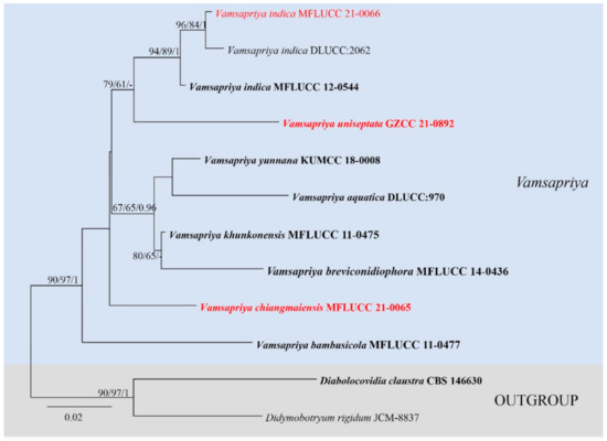 The ITS based on Vamsapriya analyses contained 12 taxa and rooted with Diabolocovidia claustra (CBS 146630) and Didymobotryum rigidum (JCM-8837). The manually adjusted ITS alignment contained 563 characters. The best scoring RAxML tree with a final likelihood value of −1737.963458 is presented (Figure 2). Maximum parsimony analysis comprised 563 characters, of which 446 were constant, 54 were parsimony-informative, and 63 were parsimony-uninformative; the tree length is 184, CI = 0.739, RI = 0.597, RC = 0.441, HI = 0.261. The results showed our strain MFLUCC 21-0066 clustered together with V. indica (MFLUCC 12-0544 and DLUCC:2062) with good supports (ML-bs = 94%, MP-bs = 89%, BYPP = 1.00). Vamsapriya chiangmaiensis (MFLUCC 21-0065) formed a distinct clade, and Vamsapriya uniseptata (GZCC 21-0892) grouped with three V. indica (ML-bs = 79%, MP-bs = 61%).