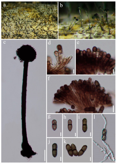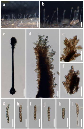 Vamsapriya uniseptata (GZAAS:21-0378, holotype) (a,b) Colonies on natural substrate. (c) Conidiophores and conidia. (d–f) Conidiogenous cells and developing conidia. (g–k) Conidia. (l) Germinated conidium. Scale bars: c = 100 µm, d,e,g,h = 5 µm, f = 10 µm.