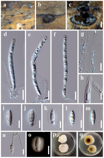 Vamsapriya chiangmaiensis (MFLU 21-0087, holotype) (a,b) Appearance of ascomata on host substrate. (c) Vertical section of ascoma. (d–f) Asci. (g) Paraphyses. (h) Apical ring of asci. (i–m) Ascospores. (n) Germinated ascospore. (o) Ascospore stained in Indian ink. (p,q) Colonies on PDA. Scale bars: c = 200 μm, d–g = 20 μm, f,h–o = 10 µm.