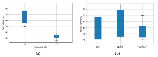 Alpha diversity (species richness) in the upper soil layer. (a)difference in sampling sites, (b)difference between collection seasons. Faith’s PD index reflects the diversity of ASVs in samples—the greater the Faith’s PD index, the higher the diversity of the microbiota. Boxplots represent the interquartile range (IQR) between the 1st and 3rd quartiles, and the horizontal line defines the median.