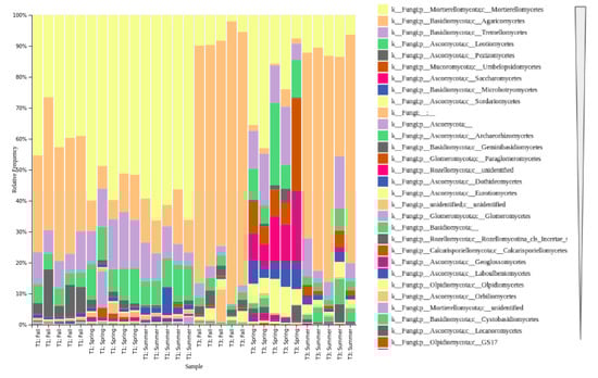 Most abundant fungal classes in soil samples based on ITS analysis, separated by sampling site and season (T1—Chernevaya taiga, T3—control soils). UNITE database v.8.2 [] was used for the taxonomic assignment.