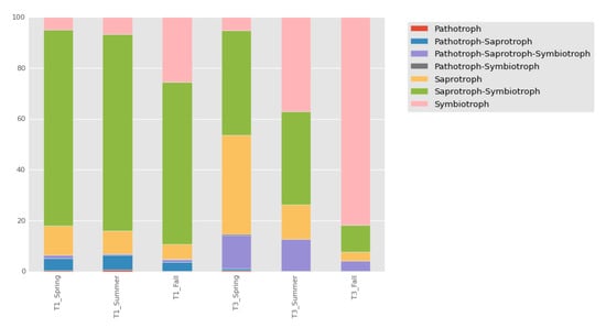 As a next step, we studied the global picture of the ecological properties of the communities using the FUNGuild approach []. The ratio of the different trophic modes in the samples from Chernevaya taiga remained more stable at different seasons (see Figure 4). We observed a dominance of saprotrophs and symbiotrophs in the Chernevaya taiga samples. It was expected to see an abundance of saprotrophs, given the high decomposition rate of the leaf litter in this ecosystem, but the significant amount of symbiotrophs requires a more thoughtful examination.