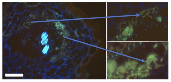 Aconitum septentrionale root samples colonized by arbuscular mycorrhiza fungi. Cryomicroscopy section, thickness 40 µm. Fungal walls are stained with DAPI-WGA (green). Bars 100 μm.