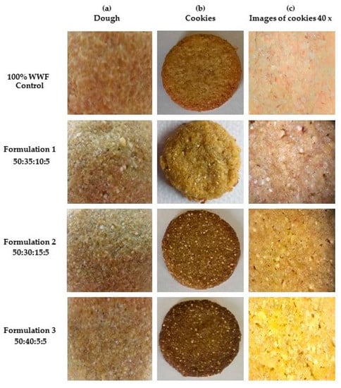In order to demonstrate POF, NF and AF’s applicability in confectionery products’ fortification, an attempt was made to add more value to standard cookies, by replacing up to 50% of WWF. Figure 2 shows representative photographs of doughs (a), obtained cookies (b), and microscopical appearance of cookies at 40× magnification (c). As expected, results on the physical characteristics of fortified cookies samples at all formulations showed similar weights (4.3 ± 0.2 g), determined using an analytical electronic balance, without significant differences from the control cookies (p > 0.05).