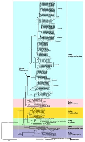 Cantharellus Adans. ex Fr., typified by C. cibarius Fr., is an important genus of wild edible mushrooms and is renowned for its high culinary, economic, and ecological value. Chantarelles have a global distribution and are especially rich in subtropical to tropical zones, demonstrating ectomycorrhizal associations with a variety of plants []. Approximately 300 species have been estimated to exist worldwide, and nearly 180 species have been described thus far [,]. Cantharellus species possess a colourful pileus, nearly smooth to evidently lamellate-folded hymenophore with variously forked or anastomosing veins, and smooth basidiospores [,,]. It is easy to recognise Cantharellus species at the genus level in the field solely based on their morphological features. However, the determination of their taxonomic positions at the species level is extremely complicated owing to overlaps in phenotypic variation among species. With the development of molecular biology, molecular-based studies have provided a basis for species identification and taxonomic development, especially for the molecular review of some type specimens and for re-classification of some old species based on new collections, so as to make species recognition more effective and accurate [,,,,,]. Molecular phylogenetic studies have delimited several species and revealed an unexpected species diversity. The tef1 gene has been identified as a suitable DNA barcoding marker to determine terminal relationships among closely related Cantharellus species [,,,,,].