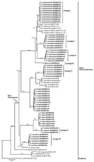 The names of the European and American species, such as C. cibarius Fr., C. cinnabarinus Schwein.) Schwein., and C. minor Peck, are often misapplied in Chinese samples, and a large number of undescribed taxa exist in China [,]. Thus far, only the following 10 species have been originally described from China: C. albus S.P. Jian & B. Feng, C. hainanensis N.K. Zeng, Zhi Q. Liang & S. Jiang, C. hygrophoroides S.C. Shao, Buyck & F.Q. Yu, C. macrocarpus N.K. Zeng, Y.Z. Zhang & Zhi Q. Liang, C. phloginus S.C. Shao & P.G. Liu, C. tuberculosporus M. Zang, C. vaginatus S.C. Shao, X.F. Tian & P.G. Liu, C. versicolor S.C. Shao & P.G. Liu, C. yunanensis W.F. Chiu, and C. zangii X.F. Tian, P.G. Liu & Buyck [,,,,,,,,,].