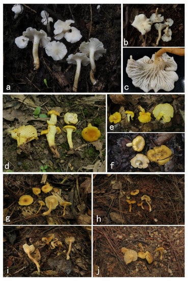 Species of Cantharellus subg. Parvocantharellus from China. (a–c) C. albus (a) GDGM56646; (b) GDGM73460; (c) GDGM81399; (d–f) C. aurantinus (d) GDGM46278 holotype (e) GDGM46279; (f) GDGM81889; (g–j) C. austrosinensis (g) GDGM81249 holotype (h) GDGM80151; (i) GDGM80211; (j) GDGM80296.