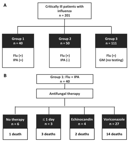 A total of 201 critically ill patients with positive testing for influenza were enrolled and were classified into three groups (A) and clinical outcome of group 1 (B) in real-world data from 2016 to 2018. Note. Flu, influenza assay; GM, galactomannan assay; (+), positive result; (-), negative result.