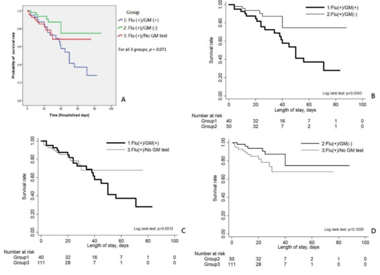 The overall survival using time-to-event analysis was lowest for group 1 of severe influenza patients with concomitant IPA among all three influenza groups (p = 0.071, Figure 2). For further comparison, the time-to-survival event of group 1 was significantly lower than that of group 2 (p = 0.034), but was not significantly different to that of group 3 (p = 0.551), while time-to-survival event of group 2 was not significantly different to that of group 3 (p = 0.103).