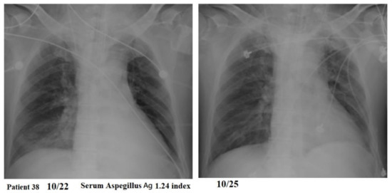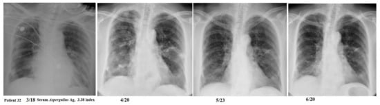 A 64-year-old woman had a serum Aspergillus galactomannan test of 3.38 index and did not receive any antifungal therapy but experienced a prolonged course of more than 3 months for resolution of the bilateral pulmonary infiltrations.