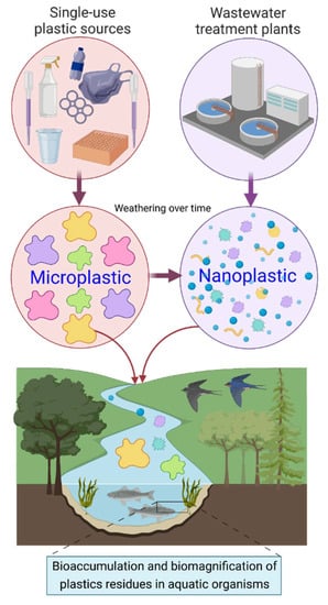 Accumulation of synthetic plastic debris at landfill sites and aqueous environments poses numerous detrimental effects on the entire ecosystem and its living beings [,,]. Considering the plastic disposal in the aquatic environment alone, more than 9 million tons of plastic is dumped in oceans, which is expected to increase to double by 2025 [,]. Additionally, some chemicals that are added to plastics during their processing to improve their characteristics are toxic and hazardous to mammalian and marine life and affect chemical communication in aquatic ecosystems []. Furthermore, while present in the aquatic environment, plastics can attach to adjacent toxic contaminants such as heavy metals and organic pollutants creating hazardous entities. These entities, following several transformation processes, can enter various terrestrial or aquatic food chains and cause severe damage to the biota [,]. Eriksen et al. [] estimated that there were approximately 269,000 tons of plastics submerged in surface waters globally. The presence of smaller plastic pieces in surface waters tends to result from the low degradability of larger pieces (macro-plastics) into smaller fragments considered as micro-plastics and/or nano-plastics. Figure 1 illustrates a schematic representation of various plastic sources, their ultimate weathering over time into micro-plastic and nano-plastic, and released into rivers, seas, and oceans. Considering the persistence/occurrence of plastics in the environment, plastics are divided into the following categories: (1) macro-plastics with particle size ranges >2.5 cm, (2) meso-plastics with particle size ranges from 2.5 cm to 5 mm, (3) micro-plastics with particle size ranges between 1 micron to 5 mm, and (4) nano-plastics with particle size ranges between 1 to 100 nm [,,]. The reported effects of micro-plastic-based environmental pollutants on aquatic life include nearly 700 species, from tiny zooplankton to the largest whales. Out of the hundreds of aquatic species that are impacted adversely by micro-plastic pollution, 17% are IUCN (International Union for Conservation of Nature) red-listed species, and at least 10% have ingested plastics [].