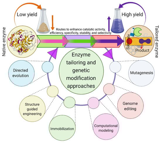 The above-discussed shortcomings of enzymes can be overcome via enzyme tailoring and genetic modification practices. In addition, the tailored or genetically engineered enzyme-based catalysis offers multi-benefits, such as mild processing for complex and stable compounds, e.g., PET, and the capability to diminish reaction by-products or limit the generation of intermediate secondary products (that resist the enzymatic PET biodegradation) [,,]. Moreover, the genomic modification settings/protocols that could enhance the PET biodegradation potential of enzymes, i.e., esterases, lipases, cutinases, and others need to be improved/modified. Several strategies, such as random mutagenesis and site-directed mutagenesis, genome editing, computational genomics and advanced computational modeling, structure-guided protein tailoring, and directed evolution are among the recent strategies that have been implemented to address the catalytic limitations of enzyme engineering (Figure 4) [].