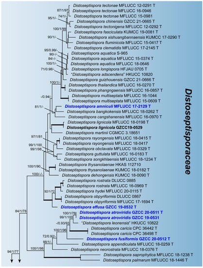 The ex-type and additional strains of Distoseptisporaceae species and related families (Acrodictyaceae, Aquapteridosporaceae, Bullimycetaceae, Cancellidiaceae, Papulosaceae, and Pseudostanjehughesiaceae) were selected in the phylogenetic analyses (Table 1). Four gene regions LSU, ITS, TEF1α, and RPB2 were used for the multi-gene analyses. Sequences were optimized manually to allow maximum alignment and maximum sequence similarity. The sequences were aligned using the online multiple alignment program MAFFT v.7 (Available online: http://mafft.cbrc.jp/alignment/server/ (accessed on 3 August 2021)) [35]. The alignments were checked visually and improved manually where necessary.