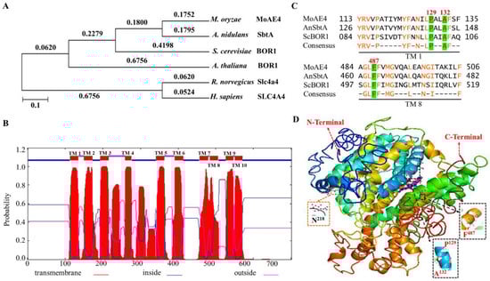 Structure of the MoAE4 and phylogenetic analysis. (A) Phylogenetic tree. It was constructed with reported anion exchange protein 4 homologs from M. oryzae, A. nidulans, S. cerevisiae, A. thaliana, R. norvegicus, H. sapiens, indicating that MoAE4 has a relatively close relationship with the fungal group. (B) TMHMM posterior probabilities for WEBSEQUENCE (on-line analysis). A schematic diagram of the MoAE4 protein transmembrane domain of M. oryzae is shown indicating the 10 transmembrane domains and marked the amino acid inside and outside the membrane. (C) Sequence alignment. The transmembrane domain 1 and 8 of MoAE4 was compared with closely related to the fungal group A. nidulans SbtA gene and S. cerevisiae BOR1 gene. (D) Tertiary structure (3-D). The structure was predicted using the web-based server I-TASSER that shows the ligand binding site residues of transmembrane domain P129, A132, and F487. The active site residue is N218.