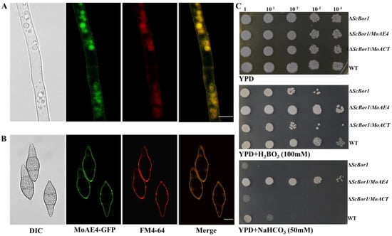 MoAE4 subcellular localization and functions in yeast. (A) Subcellular localization in hyphae (6d). Green fluorescence signals of the MoAE4–GFP protein of 6–day–old hyphae was examined by confocal microscopy and co–localized with FM4–64 on cytomembrane and tonoplast. Scale bar = 10 µm. (B) Subcellular localization in conidia. A strong green fluorescence signal of the MoAE4–GFP protein co–localized with FM4–64 red fluorescence was detected on the cytoplasmic membrane in conidia. Scale bar = 10 µm. (C) Functional complementation of MoAE4 for ScBor1 in S. cerevisiae. In total, 10 μL droplets containing the indicated concentration of yeast cells were inoculated on to the Solid YPD medium Plates (100 mM H3BO3 and 50 mM NaHCO3 added, respectively). The MoAE4 gene could functionally reverse the defect of the ΔScBor1 mutant in boric acid and NaHCO3 tolerance. Representative plates were photographed 3 days post-inoculation.