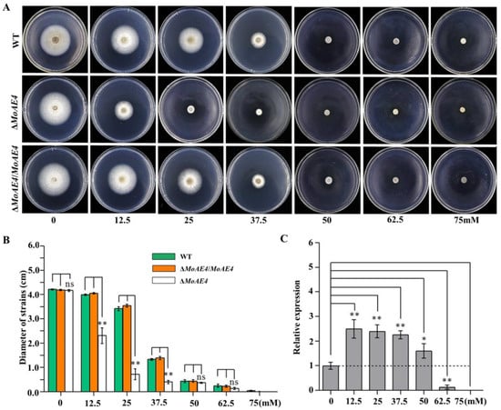 NaHCO3 stress assay of the wild type and created strains and expression patterns of MoAE4. (A) NaHCO3 stress assay. ΔMoAE4 strains were more sensitive to NaHCO3 stress than the wild-type strains. The strains were cultured in PDA media at 28 °C under 0–75 mM different concentrations of NaHCO3 and representative colonies were photographed 7 days post-inoculation. (B) The colonies diameter of the wild type, the ΔMoAE4 and ΔMoAE4/MoAE4 mutant strains following treatments under different concentrations of NaHCO3. (C) Transcription abundance of MoAE4 under different concentrations of NaHCO3. Data represent the means ± standard deviation (SD) from three independent experiments in which triplicate plates were examined for each strain in each experiment. ns p > 0.05. * p < 0.05. ** p < 0.01.