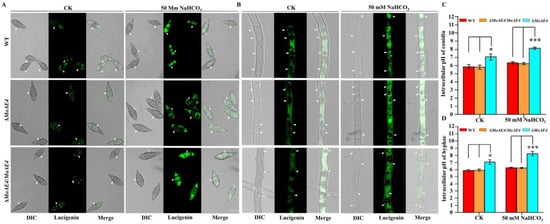 The fluorescence observations and intracellular pH value of the wild type, the ΔMoAE4 and ΔMoAE4/MoAE4 mutant strains. (A) The green fluorescence signals in hyphae. The light (left), fluorescence confocal (middle), and merge (right) microscope observations of strains hypha. Bar = 10 µm. (B) The green fluorescence signals in conidia. The light (left), fluorescence confocal (middle), and merge (right) microscope observations of strains connidia. Bar = 10 µm. (C) The intracellular pH value of conidia. ΔMoAE4 strains were obviously higher than the wild-type strains under 50 mM sodium bicarbonate. (D) The intracellular pH value of the strains in hyphae. Under 50 mM sodium bicarbonate conditions, the intracellular pH of ΔMoAE4 strains remained high in hyphae. The data represent means ± standard deviations (SD) of three experiments. * p < 0.05. *** p < 0.001.