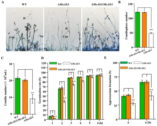 Conidium and appressorium development analysis of the wild type and created strains. (A) Conidiophores stained with lactophenol cotton blue. The conidiophores of the wild type, the ΔMoAE4 and ΔMoAE4/MoAE4 strains induced for 48 h were stained with lactophenol cotton blue, and observed and counted under a light microscope at room temperature. The hyphae are stained blue, whereas the conidiophore stalks are in gray. Bar = 50 μm. Con, conidiophores; H, hyphae. (B) Statistical analysis of the conidiophores number of the wild type, the ΔMoAE4 and ΔMoAE4/MoAE4 mutant strains. (C) Statistical analysis of conidial production in the strains. The conidia were harvested from the 3-day-old mycelium grown on OMA media, and counted using a hemocytometer for all the three strains. (D) Conidial germination rate. Conidial germination was measured on a hydrophobic cover slips and was calculated under the microscope at 1, 2, 3, 4, 5, and 6 h post inoculation. (E) Appressorial formation rate. Appressorial formation was measured on a hydrophobic cover slips and was calculated under the microscope at 4 and 6 h per inoculation. The analysis was performed using an independent samples t-test. ns p > 0.05. * p < 0.05. ** p < 0.01. Error bars indicate the mean ± SD from three independent experiments.