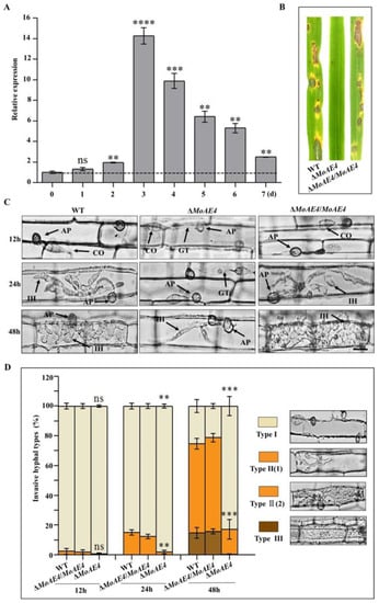 Pathogenesis analysis of the wild type and created strains. (A) Transcription abundance of MoAE4 during disease development. (B) Spray-inoculation assay. (C) Rice leaf sheath infection assay. Scale bar = 10 μm. IH, infectious hyphae; CO, Conidium; GT, Germination tube; AP, appressorium. (D) The infection rate was calculated according to the number of type I to type III events. The infection status of more than 100 germinated conidia per leaf sheath was scored at 12, 24, and 48 h post inoculation. Type I, conidia with mature appressoria; Type II, primary hyphae formed, infectious hyphae extended and branched in one cell; Type III, infectious hyphae crossing to neighboring cells. Values represent the averages of five measurements ± standard deviation. The statistical analysis was performed using a one-way ANOVA with Tukey’s multiple comparison test. The averages were taken from the quadruplicate analysis. Values are based on three biological samples and error bars indicate SD, ns p > 0.05. ** p < 0.01; *** p < 0.001. **** p < 0.0001.