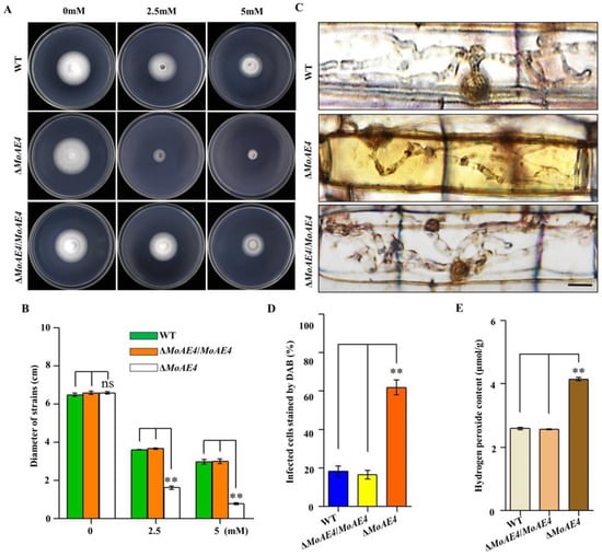 Comparison of oxidative stress, DAB staining, and endogenous H2O2 among the wild type, the ΔMoAE4, and ΔMoAE4/MoAE4 strains. (A) H2O2 stress assay. The strains were cultured in CM media for 7 days at 28 °C with 2.5 or 5 mM H2O2. (B) The colonies diameter of the wild type, ΔMoAE4, and ΔMoAE4/MoAE4 following treatment with 2.5 or 5 mM H2O2. (C) DAB staining of leaf sheath cells of rice infected by wild type, mutant and complementation strains at 36 hpi. Scale bar = 10 μm. (D) Statistical analysis of DAB staining of leaf sheath cells infected by different strains. (E) Endogenous H2O2 assay. The strains of hyphae of Endogenous H2O2 were determined as described in Experimental Procedures. The above experiments were performed in triplicate and repeated three independent times for each strain. Error bars represent the ± SD of three independently repeated samples, ns p > 0.05. ** p < 0.01.