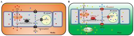 CO2, as a labile molecule, is the oxidation waste product of mitochondrial respiration. In humans, redundant CO2 must be released, or the equilibrium with HCO3− + H+ will be disturbed. The ability of HCO3− to undergo pH-dependent conversions is central to its physiological role [1]. CO2 enters the cytoplasm through the membrane and is rapidly hydrated forming carbonic acid (H2CO3). This acid is dissociated into H+ and HCO3− by intracellular carbonic anhydrases [7]. Under normal medium culture conditions, pathogenic fungi such as yeast may not require the anion exchanger/carbonic anhydrase system to help the release of metabolic CO2 [11]. However, the interaction system between host plant and pathogen forms a whole multicellular organism, which should face a challenge in moving membrane impermeant bicarbonate from inside the cell where it is produced to the environment for disposal. In addition, during interactions between plant and pathogen, respiration from both pathogen and plant must be enhanced to produce available energy [24,47,48,49]. Therefore, we propose a pathogenic model mediated by MoAE4/MoCA (carbonic anhydrase) system (Figure 8). Under cultivation conditions, the metabolic CO2 can be released freely from M. oryzae, and both MoAE4 and MoCA genes are at low levels of expression because of the equilibrium of (CO2 + H2O ⇌ HCO3− + H+) (Figure 8A). In the process of invasive hyphae growth, the infected plant cell is a relatively high concentration of CO2 and low concentration of O2 microenvironment; and accordingly, the diffusion of fungal CO2 to the outside (cytosol of plant cell) is hindered. The upregulated MoCA (Figure S5) will increase the concentration of HCO3−, which leads to MoAE4 being upregulated, then MoAE4 transports HCO3− to the vacuole or to plant cells (Figure 8B).