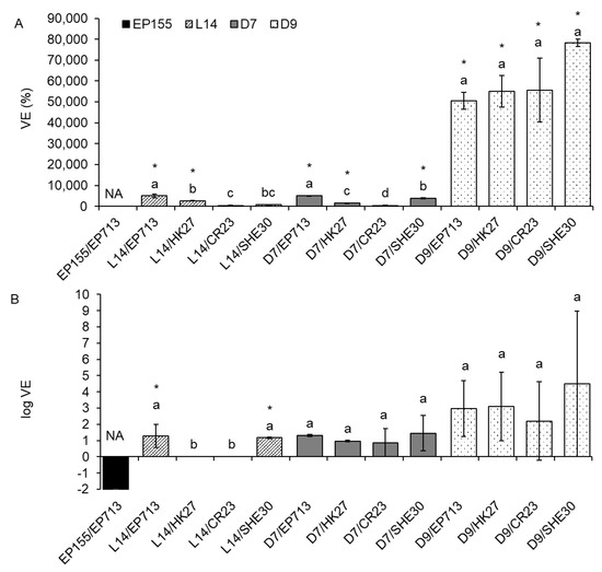 Furthermore, we wanted to define the particular effect of various virus strains on the LAC activity of the infected fungus. On solid PDA medium, CHV1 infection mostly led to an increase in laccase activity, as seen from the determined positive VE values (Figure 1). The increase was significant in most (9 out of 13) of the infected isolates in comparison to the VIR control. On MEA, an increase in laccase activity was usually observed and was significant in 2 out of 13 cases (columns marked with an asterisk in Figure 1), but in two samples, the VE equaled zero, as both the VIR and the HV sample had no measurable smLAC activity. In the prototypic EP155/EP713 experimental system grown on PDA (Figure 1A), there was no observed change upon CHV1 infection, as in both EP155 and EP155/EP713 the smLAC activity equaled zero. On the other hand, in EP155 and EP155/EP713 grown on MEA (Figure 1B), CHV1-infected mycelium showed a 100% reduction of smLAC activity. On PDA, virus strain EP713 had the strongest positive VE in fungal isolates L14 and D7. All of the tested viral isolates had a different VE in fungal isolate D7, while in fungal isolate L14, three out of four viruses exhibited a statistically different effect (Figure 1A). On the other hand, in fungal isolate D9, all CHV1 strains had a similar, very strong, positive VE. On MEA, no difference in VE was seen among virus strains, although D9/SHE30 had a VE that was two to three orders of magnitude higher than the other samples, but with extreme variance (Figure 1B, results are presented in logarithmic scale due to extreme values).