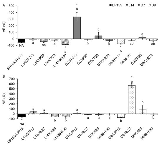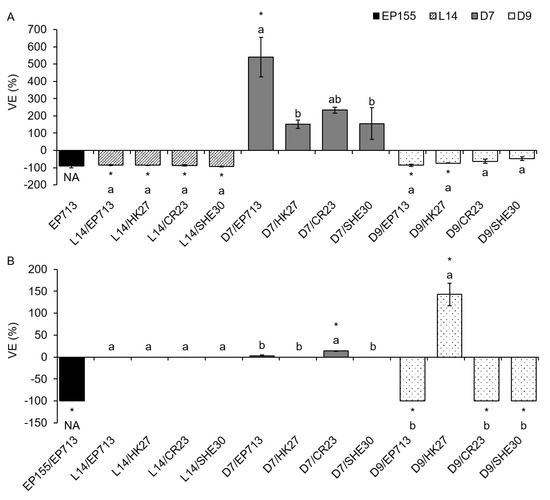 Effect of virus infection on extracellular laccase (ecLAC) activity of four Cryphonectria parasitica isolates when grown on liquid media (A) potato dextrose broth and (B) malt extract. Results are represented as mean virus effect (VE) value (difference between each triplicate measurement of HV isolat’ LAC activity and the mean of the corresponding isogenic VIR isolate LAC activity, given as a percentage of the performances of the VIR isolate) ± standard error. An asterisk (*) denotes virus-infected cultures with ecLAC values significantly different from the corresponding VIR fungal isolate. Letters denote statistical differences between different virus strains infecting the same fungal isolate at p < 0.05. NA = not applicable to the statistical comparison of virus strains due to only one fungus/virus combination. VE in (B) for all L14 isolates, D7/HK27 and D7/SHE30 equaled zero, as in both VIR and HV fungi the smLAC activity equaled zero.