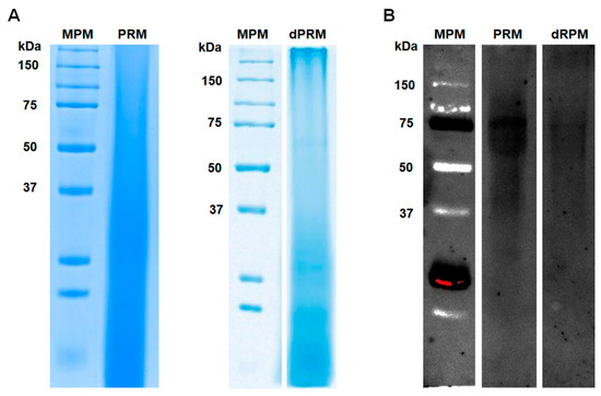 Aliquots of 75 µg PRM were subjected to denaturing sodium dodecyl sulfate-polyacrylamide gel electrophoresis (SDS-PAGE) using 12% (w/v) polyacrylamide gels and separated at 100 V for 90 min. The separated material was either used for conventional staining with Coomassie Brilliant Blue G-250 Dye (Thermo Fisher Scientific) or transferred to a nitrocellulose membrane for blotting. The membrane was blocked with 5% (w/v) polyvinylpyrrolidone (Sigma-Aldrich) in TBS buffer (50 mM Tris-HCl, pH 7.6, 150 mM NaCl) for 60 min, then was incubated for 2 h at room temperature with 1 mg mL−1 ConA-fluorescein (FITC; Sigma-Aldrich) in TBS added with 0.1% (v/v) Tween 20 (Sigma-Aldrich). Then, the membrane was washed six times with TBS-Tween and inspected in a ChemiDoc MP (Bio-Rad), using a wavelength of 520 nm.