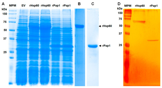 Expression of recombinant Hsp60 and Pap1 expressed in Escherichia coli. In (A), bacteria were transformed with pCold-HSP60 (rHsp60 lanes), pCold-PAP1 (rPap1 lanes), or the empty pCold I vector (EV) and grown under inducing condition (0.1 M isopropyl-β-D-1-thiogalactopyranoside and 20 h at 15 °C). Protein samples were prepared from cultured cells and separated by denaturing SDS-PAGE in 12% (w/v) gels. Two independent clones for production of each recombinant protein were analyzed. The recombinant proteins were then subjected to purification as described in the main text and were either Commassie Blue-stained ((B,C) correspond to purified rHsp60 and rPap1, respectively) or silver-stained (D). MPM, molecular protein marker.