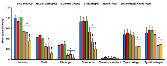 Adhesion of Sporothrix schenckii yeast-like cells to immobilized extracellular matrix proteins. The extracellular matrix proteins were immobilized in the 96-well plates and used in ELISA-based analyses. Yeast-like cells were added to the plates, nonadherent cells were washed, and cells bound to extracellular matrix proteins were detected with anti-rGp70 antibodies and peroxidase-conjugated anti-rabbit IgG. No antibody, cells were pre-incubated with PBS; Control (rHsp60) and Control (rPap1), cells were pre-incubated with pre-immune sera; anti-rHsp60, cells were pre-incubated with polyclonal anti-rHsp60 antibodies; and anti-rPap1, cells were pre-incubated with polyclonal anti-rPap1. Results are means ± SD of three independent experiments performed by duplicate. * p < 0.05 when compared to cells pre-incubated with PBS. † p < 0.05 when compared to cells pre-incubated with anti-rHsp60 or rPap1. ‡ p < 0.05 when compared to cells pre-incubated with anti-rHsp60.