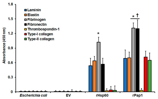 Adhesion of recombinant Hsp60 and Pap1 to immobilized extracellular matrix proteins. The extracellular matrix proteins were immobilized in 96-well plates and used in ELISA-based analyses. Cell homogenates from nontransformated bacteria (Escherichia coli) and bacteria transformed with the empty vector (EV) expressing rHsp60 (rHsp60) or rPap1 (rPap1) were incubated with the immobilized extracellular matrix proteins, and the protein–protein adhesion detected with the specific polyclonal anti-rHsp60 or anti-rPap1 and peroxidase-conjugated anti-rabbit IgG. Results are means ± SD of three independent experiments performed by duplicate. * p < 0.05 when compared to the other immobilized proteins. † p < 0.05 when compared to cell homogenates containing rHsp60.