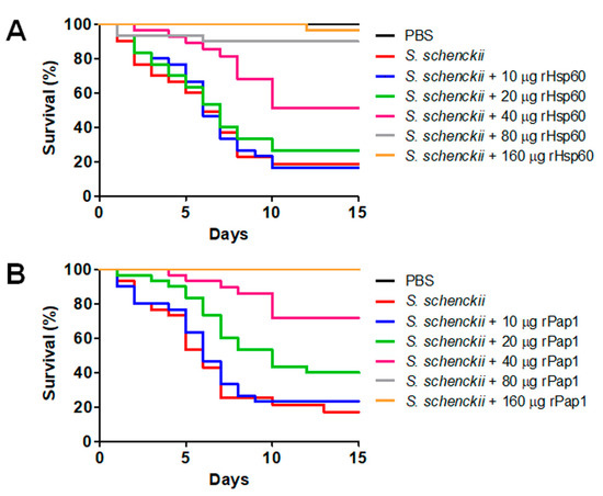 Effect of recombinant Hsp60 and Pap1 on the Galleria mellonella killed by Sporothrix schenckii. G. mellonella larvae were inoculated with either phosphate-buffered saline (PBS) or the indicated amount of rHsp60 (A) or rPap1 (B) and incubated for 5 days at 37 °C. Then, a lethal S. schenckii inoculum of 1 × 105 yeast-like cells was injected into larvae, which were kept at 37 °C, and mortality was recorded daily. PBS, control group inoculated and challenged with PBS. S. schenckii, animal group inoculated with PBS and challenged with 1 × 105 yeast-like cells.