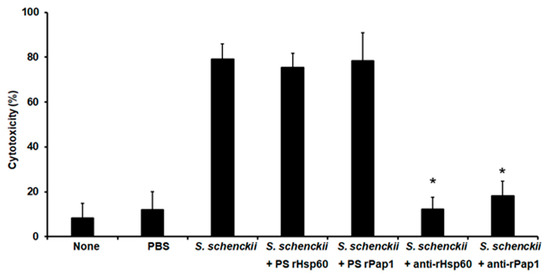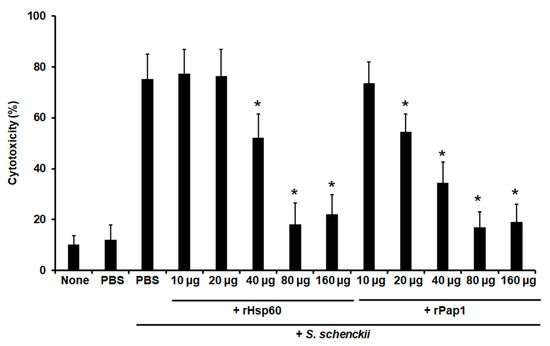 Moreover, cell-free LDH activity was measured as an indicator of cellular cytotoxicity, as previously reported [7,64]. Animal groups pre-incubated with 10 or 20 µg Hsp60 showed similar cytotoxicity levels to the control group pre-inoculated with PBS and challenged with yeast-like cells (Figure 6), but pre-inoculation of 40 µg Hsp60 significantly reduced cytotoxicity levels, and these were even more diminished with pre-inoculation of either 80 or 160 µg Hsp60 (Figure 6). When rPap1 was used in the pre-inoculation stage, 10 µg did not affect cytotoxicity levels, but 20 µg significantly reduced the values of free LDH, and those were even more reduced with pre-inoculation of either 40 or 80 µg rPap1 (Figure 6). The cytotoxicity associated with the pre-incubation of 160 µg rPap1 was similar to that obtained with 80 µg Pap1 (Figure 6).