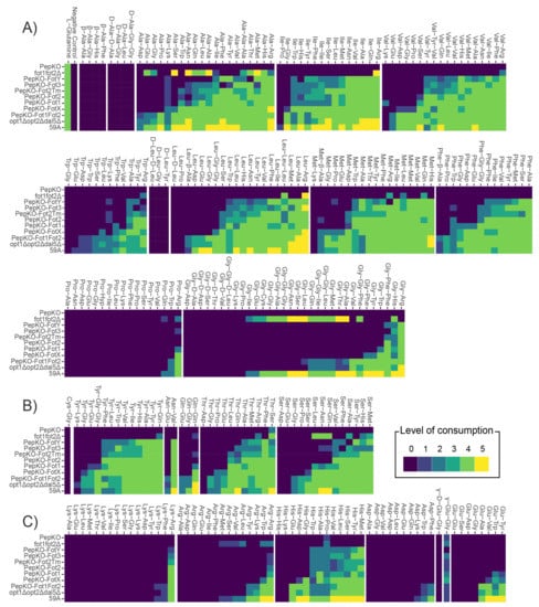Oligopeptide preferences depend on the character of the amino acid residues. In this figure, di- and tripeptides are classified based on the amino acid type at the N-terminal position. Levels of consumption are expressed in comparison to the consumption value of L-glutamine, as a positive control in each plate; level 0, 0–20% of consumption on L-Gln; level 1, 21–40%; level 2, 40–60%; level 3, 60–80%; level 4, 80–100%; level 5, >100%. (A) Peptides with hydrophobic amino acids. (B) Peptides with polar, uncharged amino acids; (C) Peptides with charged amino acids.