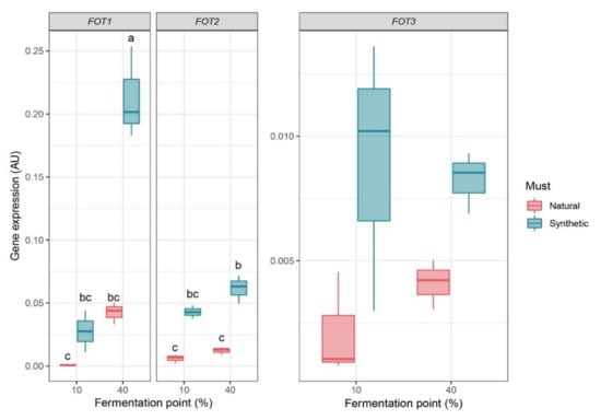 Two S. cerevisiae wine strains were selected to analyze the expression of FOT1, FOT2 and FOT3. Strain 59A contains FOT1 and FOT2 tandem genes, while strain MTF2533 only has FOT3. Two conditions of enological fermentation were evaluated: on one hand, a natural Colombard grape must (Caussens, France, 2019) containing 257 mg/L of assimilable nitrogen and 183 g/L of sugars; on the other hand, a synthetic must with the same concentrations of assimilable nitrogen and sugars. Additionally, FOT expression was analyzed at two key points of enological fermentation (Figure S3): 10% of fermentation, point at which cells were at mid-log phase of growth and had not yet reached the maximum fermentation rate or Vmax, and 40% of fermentation, which corresponded to a time point of fermentation after Vmax, when cells were in stationary phase. FOT expression was quantified by qPCR and normalized with expression values of the housekeeping gene SCR1.
