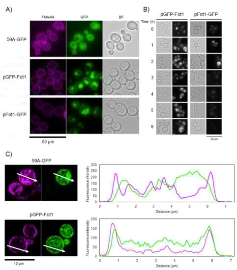 In strain 59A expressing pFot1–GFP or pGFP–Fot1, we observed the Fot1 fusion protein localized at the plasma membrane after 1 h of growth in YPD (Figure 4A). This conclusion was corroborated by FM4–64 staining, a membrane-selective fluorescent dye (Figure S4). We also observed some internal vacuolar fluorescence, most probably due to the overexpression induced by the TEF promoter of the plasmid. By contrast, GFP fluorescence signal in control strain 59A-GFP–with the GFP gene in substitution of the coding sequence for cytosolic protein Amn1–was observed at the cytosol. Although the GFP signal was detected at the plasma membrane when Fot1 was tagged at the N- or C- terminus, (Figure 4A,B, 1 h of growth in YPD), the signal was clearer and more stable in cells expressing Fot1 with an N-terminal GFP fusion, with GFP fluorescence detected at the plasma membrane even after 6 h (Figure 4B). However, no pFot1–GFP fluorescence was detected at the plasma membrane time after 1 h of growth on YPD. This instability of the pFot1–GFP signal hindered its co-localization study with FM4–64 by confocal microscopy (Figure 4C). Confocal microscopy analysis showed that the GFP signal in control strain 59A-GFP was found in the cytosol and did not overlap with FM4–64 signal peaks at the plasma membrane, despite some partial internalization of the dye into the vacuolar membrane and lumen Fot1 (Pearson’s coefficient = 0.532). By contrast, the peaks of the GFP signal overlapped with those of FM4–64 signal in pGFP–Fot1 (Pearson’s coefficient = 0.773), confirming the Fot1 plasma membrane localization in S. cerevisiae.