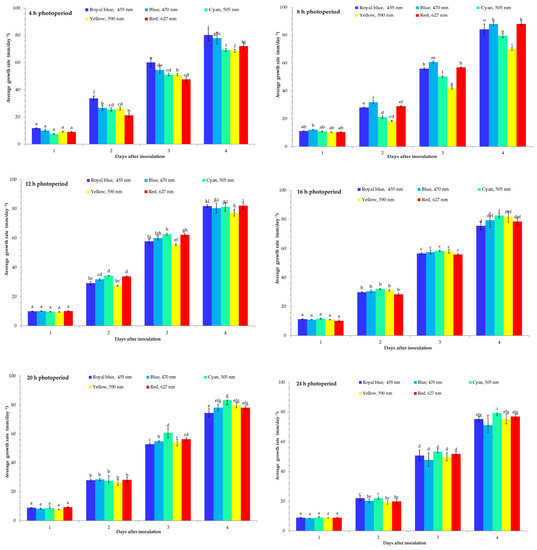 The average mycelium growth rate of illuminated Botrytis cinerea under 4, 8, 12, 16, 20, and 24 h photoperiods and different wavelengths. All values in the figure are expressed as mean ± standard error (n = 4). Means with different letters are significantly different at the p < 0.05 level according to Duncan’s multiple range test.